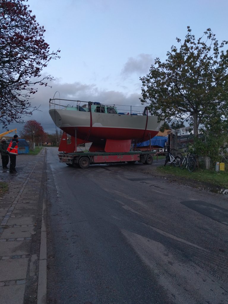 Soviel zu der Nervosität vor dem ins Wasser setzen, der Moment selber war dann aber gar nicht so aufregend, sondern einfach nur schön. Der ganze Prozess hat sich ein bisschen gezogen, erst hat der LKW keinen Anhänger mitgehabt und einen holen fahren müssen und dann ist dem Gabelstapler das Gas ausgegangen, genau in dem Moment, in dem Erato auf dem Anhänger mitten auf der Straße gestanden ist. Gute 20 Minuten haben wir die Straße halb versperrt, bis Peter mit neuem Gas gekommen ist. Somit wars dann schon recht dunkel, wie wir endlich im Wasser waren.
