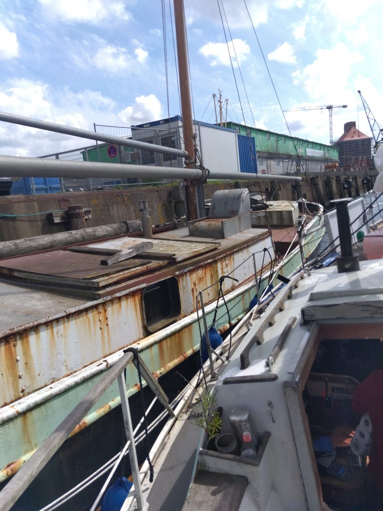 Am Dienstag war der misslungene Trip, am Mittwoch haben wir nicht viel gemacht. Erst lang geschlafen und dann versucht herauszufinden, wem wir Bescheid sagen müssen, dass wir da angelegt haben. Schlussendlich haben wir ein Büro von der Flensburger Hafen GmbH gefunden, dort hat uns jemand eine Nummer von dem Verantwortlichen gegeben und der war in einer sympathischen Art desinteressiert (Ich: „Also, wir hatten gestern Abend Motorprobleme und sind nicht mehr weitergekommen. Jetzt liegen wir da, wo Kimiq, der Holzkutter, liegt. Hoffentlich können wir heute oder morgen oder in den nächsten Tagen geschleppt werden.“ Er: „Ja, alles kein Problem, solange ihr nicht im abgesperrten Bereich liegt. Tschüss!“).
